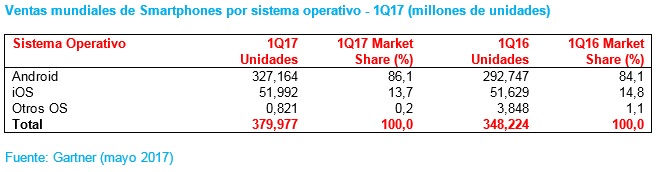 Las ventas globales de smartphones totalizaron 380 millones de unidades en el primer trimestre de 2017, lo que significa un 9,1% más respecto al mismo periodo de 2016, según datos facilitados por Gartner. Se extrae del estudio que los compradores están gastando más con objeto de adquirir dispositivos de mayor calidad, lo que repercute en un aumento en la media de precios.