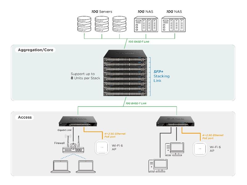 La familia DGS-1520 incorpora modelos de 28 y 52 puertos Gigabit, todos ellos con enlaces ascendentes 10 Gigabit mediante cobre 10GBASE-T o por fibra SFP+ para entornos donde se requiera larga distancia. Estos uplinks a 10 Gigabit proporcionan la conectividad necesaria para integrar el core o ser los enlaces a servidores. Admiten stacking de hasta 8 switches por pila, usando tanto fibra (2 puertos SFP+) como cobre (2 puertos 10G Base-T) o bien en modo híbrido (2 de cobre y 2 de fibra), que añade flexibilidad y reduce el coste del cableado utilizando cobre en lugar de todo fibra. En apilado alcanza un ancho de banda de 80G y hasta 384 puertos gigabit por pila.