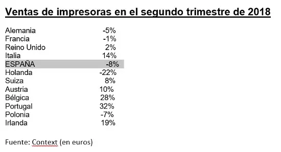 En España, los ingresos por la venta de impresoras cayeron un 8% durante el segundo trimestre del año. Los datos de Context no muestran una tendencia clara en el continente, y durante el periodo hubo mercados con un alto crecimiento, como el portugués (32%) o el belga (28%) y otros donde el batacazo fue sonado, como el holándes (-22%). En mercados de referencia, como el británico, el comportamiento fue poco llamativo (2% de avance), mientras que en Alemania las ventas cedieron un 5% con respecto al mismo periodo de 2017.