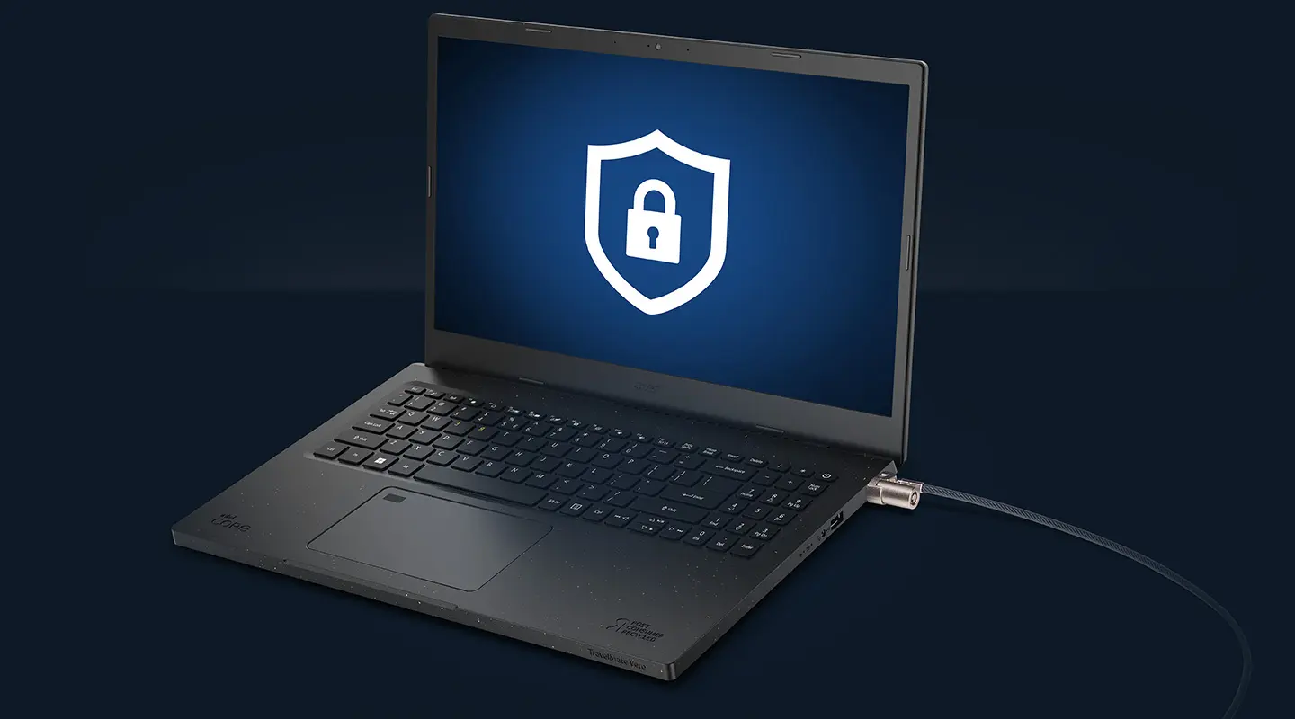 El discreto TPM y el conector Kensington proporcionan seguridad y capacidad de gestión de nivel empresarial al mismo tiempo que protegen físicamente tus datos. TravelMate Vero también cuenta con Acer ProShield Plus, una solución de software todo en uno que protege tu dispositivo TravelMate de accesos no autorizados e intrusiones, a la vez que admite las funciones de autenticación biométrica proporcionadas por Windows.