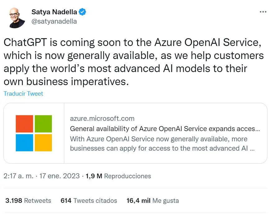 Este servicio incluye GPT-3.5, Codex y DALL•E 2, junto a las capacidades de nivel empresarial y la infraestructura optimizada para IA de Azure. Además, en un futuro próximo, Microsoft asegura que sus clientes podrán acceder al chatbot ChatGPT, una versión perfeccionada de GPT-3.5 y que está dando mucho que hablar en los últimos meses. También Satya Nadella lo ha comunicado por su cuenta de Twitter.