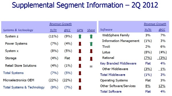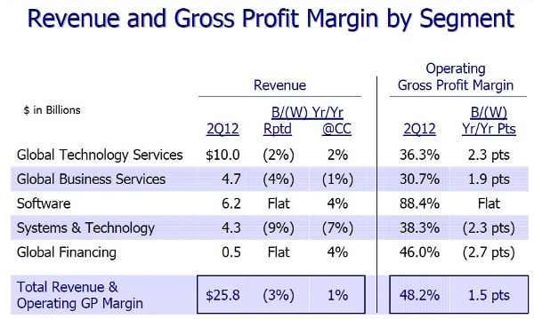 Al igual que Intel, el rendimiento económico de IBM es otro de los indicadores que dan testimonio de la situación actual de la industria TIC. El Gigante Azul ha cerrado su segundo trimestre fiscal con una caída de las ventas del 3,3% sobre el mismo periodo del año anterior, al facturar 25.780 millones de dólares. Este declive se ha debido a que las ventas en el negocio de software y en los mercados emergentes se ralentizaron durante este periodo (en Intel, también se han desinflado los ingresos de los mercados emergentes).