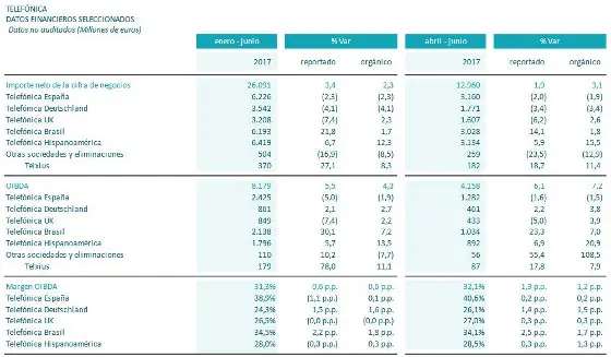 Sobre estos resultados, José María Álvarez-Pallete, presidente ejecutivo, ha señalado: “Durante el segundo trimestre del ejercicio hemos acelerado nuestro crecimiento orgánico, ejecutando nuestra estrategia basada en una calidad estructural, que se refleja en la fuerte posición competitiva en nuestros principales mercados. Asimismo, continuamos avanzando en la transformación hacia una Compañía de plataformas, con una inversión enfocada en redes de ultra banda ancha, impulsando la digitalización extremo a extremo y la inteligencia cognitiva, con una propuesta de valor diferencial para los clientes. Todo ello, con un balance más fuerte, tras duplicar el flujo de caja libre en los últimos doce meses y reducir la deuda neta en 5.000 millones de euros, considerando la venta de la participación en Telxius. La fortaleza y mejores tendencias del negocio en la primera mitad del año y el buen posicionamiento para seguir capturando crecimiento sostenible en los próximos trimestres nos permiten revisar al alza nuestros objetivos para el ejercicio 2017”