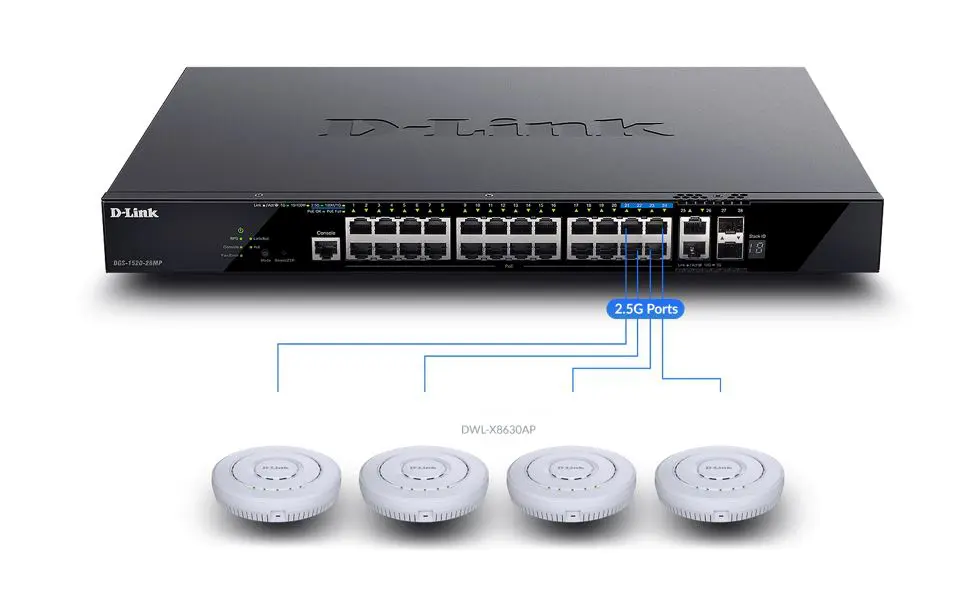 Las versiones PoE (Power Over Ethernet para suministrador datos y alimentación eléctrica por el mismo cable de red) integran 4 puertos Multigigabit PoE, ideales cuando se conectan puntos de acceso Wi-Fi 6, ya que los puertos Gigabit ya no son capaces de proporcionar todo el ancho de banda que necesita la tecnología Wi-Fi 6. D-Link ya dispone de una completa gama de puntos de acceso Wi-Fi 6. más información en nuestra web dedicada a Wi-Fi 6.