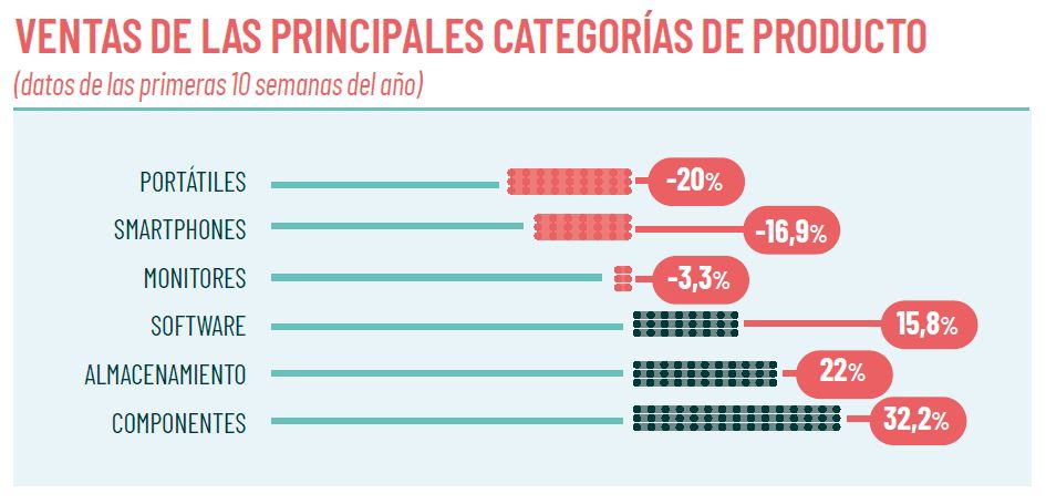 Portátiles y smartphones, las categorías de producto que más reportan al canal en términos de ingresos, se desplomaron en ese periodo un 20% y un 16,9%, respectivamente. Por el contrario, las ventas de monitores crecieron en facturación un 3,3%, mientras que las de software se elevaron un 15,8%, y las de sistemas de almacenamiento y componentes avanzaron un 22% y un 32,2%, respectivamente.