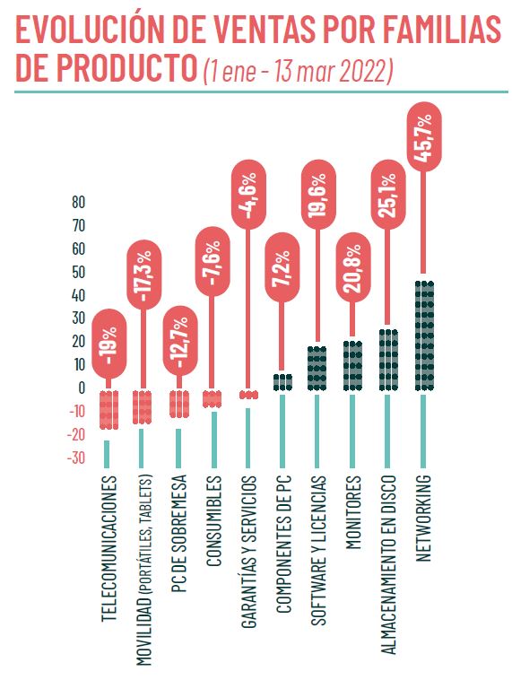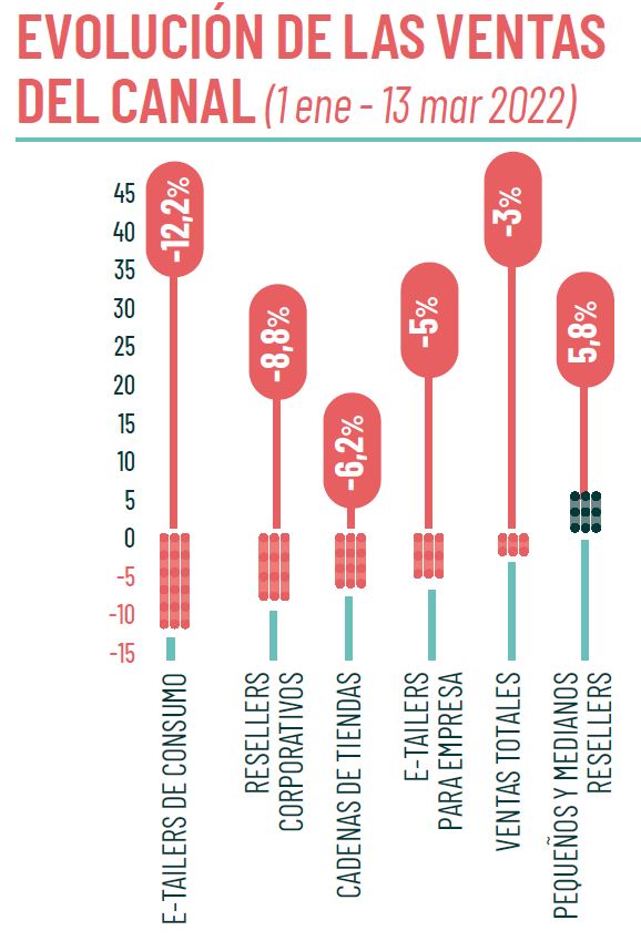 De hecho, casi todos los canales registraron retrocesos en ese periodo. El más acusado fue el de los e-commerce de informática de consumo (-12,2%), aunque también cedieron los resellers corporativos (-8,8%) o las cadenas de tiendas (-6,2%). La nota positiva la pusieron los resellers dirigidos a la pyme, que crecieron un 5,8% hasta mediados de marzo. Estas cifras demuestran que se mantienen las tendencias que se veían en el mercado a finales del año pasado, cuando el consumo se resentía por la incertidumbre general y la subida de precios, y las pymes mantenían una alta demanda de soluciones, forzadas por la necesidad de digitalizarse para adaptarse a realidades como el trabajo híbrido y en remoto.
