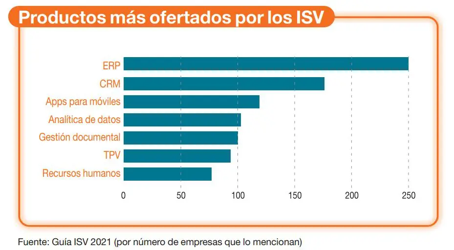En cuanto a la oferta de los ISV de la Guía 2021, el producto estrella vuelve a ser el ERP, que es ofertado por 250 compañías, más de la mitad. El CRM, la herramienta que permite a las compañías ponerse en contacto y organizar el trabajo con los clientes, es la segunda aplicación más ofertada (175 firmas la tienen en su catálogo de soluciones). Otros tipos de software que se encuentran muy extendidos en el catálogo de los ISV son las apps para móviles (123 compañías las ofertan), la gestión documental (100 compañías), la analítica de datos (104), las aplicaciones para TPV (95), las de recursos humanos (81) o las de e-commerce (49), que tanta demanda han tenido en los últimos meses por motivo de la pandemia.
