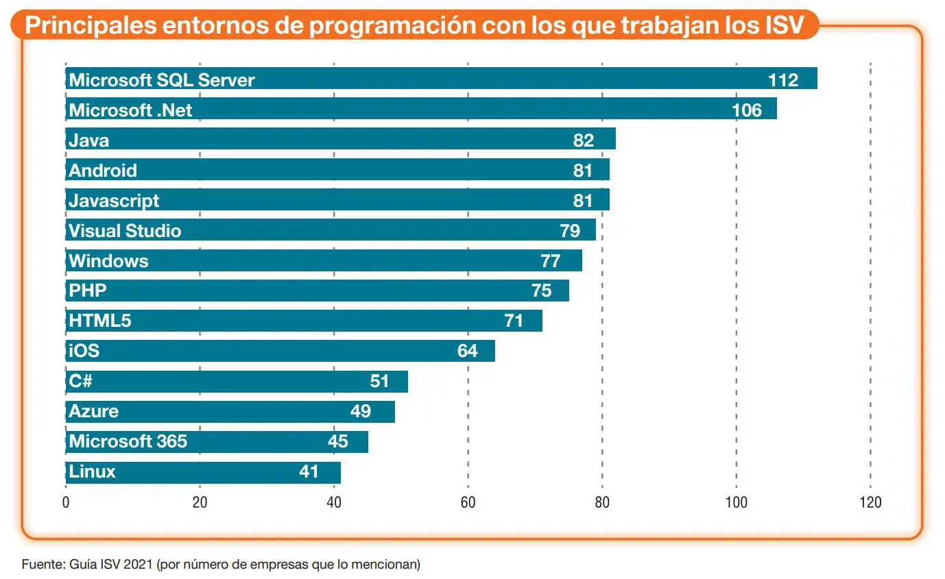 Como viene siendo habitual, Microsoft y sus entornos de desarrollo dominan cuando se pregunta a los ISV por las plataformas de las que se ayudan para construir sus soluciones. Por ejemplo, 112 firmas desarrollan para entenderse con SQL Server, y hasta 106 compañías aseguraron que desarrollan sobre .Net, mientras que 79 citaron Visual Studio y otras 77, Windows. También casi medio centenar de compañías ha adaptado su software para la nube de Microsoft (Azure). Pero en entornos de desarrollo, no todo es Microsoft. Java, por ejemplo, sigue siendo un lenguaje de programación preeminente, y en este caso ha ayudado a 82 ISV a sacar adelanta sus productos. JavaScript también es citado como entorno de programación en 81 ocasiones. Otros lenguajes a los que recurren mucho los ISV nacionales son PHP (75 compañías), HTML5 (71 compañías) o Linux (41). Además, también son muchos los que desarrollan directamente apps para móviles o adaptan su software para los smarpthones, y por eso acaban especializándose en entornos como Android e iOS. En la edición de este año de la Guía, 81 empresas se refirieron a Android como uno de los entornos de desarrollo habituales, mientras que 64 trabajan en el ámbito del iPhone.