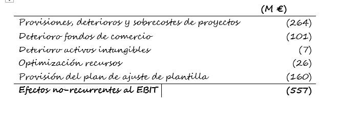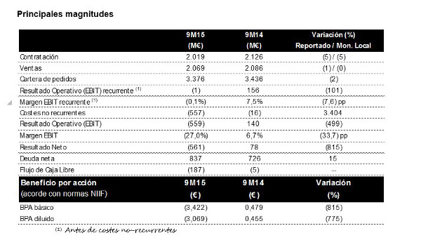 El EBIT recurrente (antes de costes no-recurrentes) en los nueve primeros meses de 2015 se sitúa en -1 millones de euros, con un margen del -0,1% (frente al 7,5% en los nueve primeros meses de 2014). El EBIT recurrente en el tercer trimestre estanco alcanza los 23 millones de euros (con un margen recurrente del 3,5%) como consecuencia principalmente del menor impacto negativo de los proyectos problemáticos tras las provisiones llevadas a cabo en el primer semestre de 2015, y los distintos planes de reducción de gastos implementados.