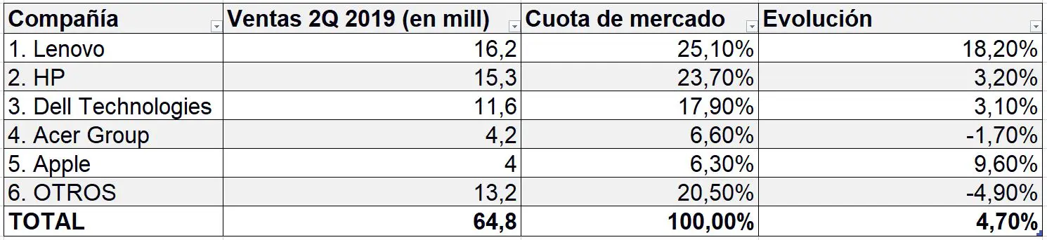 Ventas de mundiales PC en el segundo trimestre de 2019