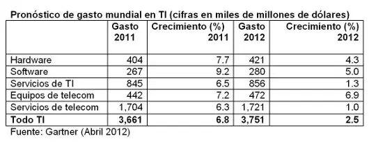 El gasto mundial en TI en 2012 alcanzará los 3,7 billones de dólares, un 2,5% más que en 2011. Sin embargo, con esta nueva cifra Gartner revisa a la baja su anterior estimación que hablaba de un 3,7% de subida.