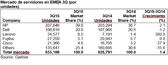 Arrastrado por el parón del segundo trimestre, el negocio de servidores sólo creció un 1,4% en la región de EMEA como consecuencia del entorno económico incierto y la debilidad de muchos países del entorno. Con 533 millones de unidades comercializadas, HP mantiene la primera posición de la tabla en la región a pesar de la caída de ingresos (-1,6%) con 207.646 máquinas entregadas y un 38,7% de cuota de mercado.