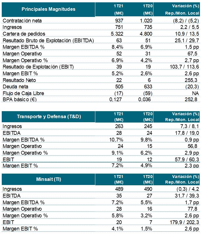 Los ingresos de la división de Transporte y Defensa en el primer trimestre de 2021 crecieron un 8,1% en moneda local (aumento del 7,3% en reportado), impulsados por el crecimiento registrado en Defensa y Seguridad (del 20,9% en moneda local), derivado de la mayor actividad en España (proyectos plurianuales de las Fragatas F110 y simulador NH90), AMEA (defensa aérea en Azerbaiyán y Vietnam) y Europa (mayor contribución del proyecto Eurofighter). Asimismo, destaca el crecimiento registrado en el segmento de Transportes (del 8,4% en moneda local), por el reconocimiento de ingresos en el proyecto ferroviario en Arabia Saudí y la mayor actividad en el proyecto de sistemas de peaje de la Autopista I-66 en EEUU.