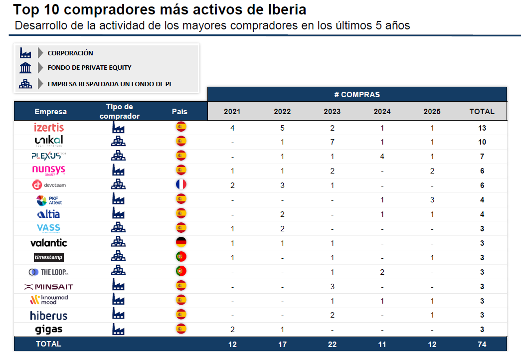 Entre los compradores más activos en los últimos cinco años destacan firmas como Izertis, Unikal, Plexus Altia, Nunsys, Devoteam, VASS o Plexus, junto a otros actores relevantes del ecosistema tecnológico, como Minsait (Indra) o Hiberus. A ellos se suman cada vez más plataformas participadas por fondos de inversión, que están desarrollando estrategias de buy-and-build para ganar escala mediante la adquisición de compañías especializadas.