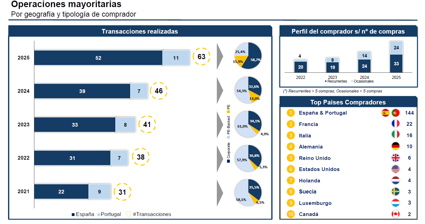 A pesar de la normalización del ciclo inversor tras los picos alcanzados entre 2020 y 2021, la actividad se mantiene robusta. En 2025 se contabilizaron 63 operaciones en la Península Ibérica —52 en España y 11 en Portugal—, superando claramente las 46 de 2024 y las 41 de 2023.
