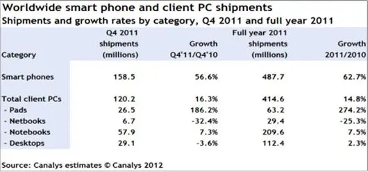 Por primera vez las ventas de smartphones sobrepasaron a las de PC. Según Canalys,en el último trimestre de 2011 se comercializaron 158,5 millones de teléfonos, un 57% más que en el mismo periodo de 2010. Este espectacular repunte en la recta final del año hizo elevar las ventas totales del ejercicio hasta las 488 millones de unidades, cifra que contrasta con los 414,6 millones de ordenadores adquiridos en las mismas fechas. De ellos, el 15% fueron tabletas, dispositivos que registraron un incremento del 274%.