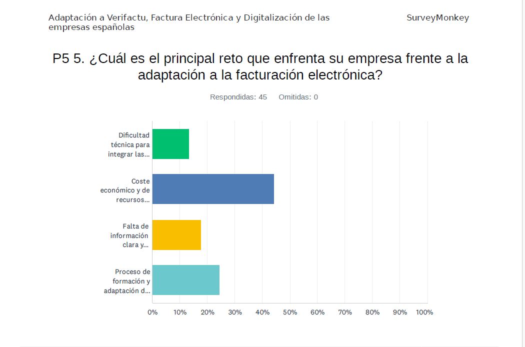 El principal obstáculo e inhibidor para el despliegue de la norma es el coste económico y de recursos (44,4%) además de la necesidad de formación y adaptación del personal a la nueva normativa (24%). En la misma línea de argumentación destacan también la falta de información clara y accesible sobre los requisitos y plazos (17%) y la dificultad para integrar las nuevas especifaciones en el software de facturación (13%)