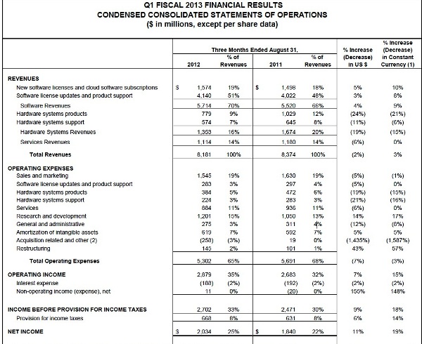 Otra de las caídas que Oracle ha experimentado en este primer trimestre, es el descenso del 5% de los ingresos por las ventas de licencias de software, que según su responsable financiero, Carol Catz, ha sido consecuencia de la fortaleza del dólar. No obstante, las licencias nuevas de software han aumentado un 11%.