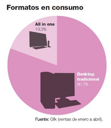 Se puede decir que las compañías siguen siendo fieles al viejo formato de desktop. De hecho, el año pasado, según Context, se vendieron casi 650.000 sobremesas empresariales, por 450.000 de consumo. Es más, cuanto mayor son las entidades, más apego tienen (según HP, en las grandes compañía sigue habiendo más desktops que portátiles, no así en las pymes donde el notebook gana por goleada). Sin embargo, los hogares hace tiempo que apostaron por la movilidad. Según Gfk, que calcula las máquinas que se venden en las tiendas de todo el país, en marzo y abril los portátiles (contado ultrabooks y netbooks) supusieron un 80% del total de las ventas, mientras que el 20% restante se repartieron entre sobremesas y torres tradicionales y los All in one, esos equipos compactos que llevan la unidad de proceso y el disco duro en la parte trasera de la pantalla.