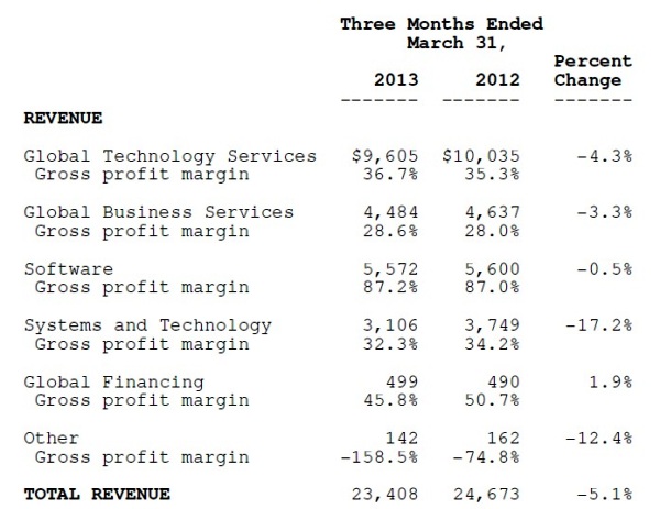 En cuanto a los beneficios, el Gigante Azul ha obtenido unas rentas netas un 1% más bajas que en el primer trimestre de 2012, con unas ganancias de 3.000 millones de dólares.