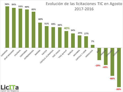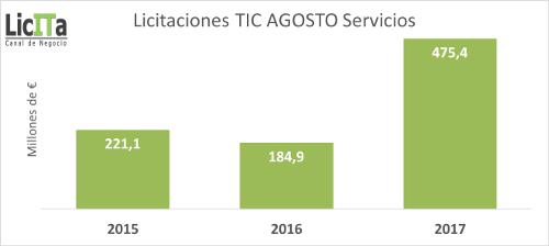 Estas cifras, atípicas en un mes de agosto, están basadas en el espectacular crecimiento de las licitaciones en Servicios TIC. En agosto de 2017 se ha licitado por un importe de 475,4 millones de euros, que significa un 61% más que el año 2016, en el que se licitaron 184,9 millones. En 2015 se licitaron 221 millones.