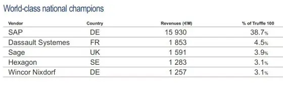 Elaborado con la colaboración de la comisaria europea de Agenda Digital, Neelie Kroes, analistas de IDC y CXP Group y la escuela de negocios Essec, el estudio también subraya las buenas perspectivas de este negocio que, pese a la caída del 8,7% de los beneficios, ha registrado crecimientos de doble dígito a nivel de ingresos (41.100 millones de euros facturados frente a los 37.200 de 2011). El 53% de la facturación total de este sector durante el pasado ejercicio la generaron los cinco primeros del ranking: SAP, Dassault Systemes, Sage, Hexagon y Wincor Nixdorf.
