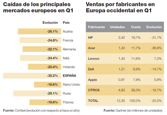 Los datos de la consultora británica Context sobre el mercado europeo de PC son demoledores. Según un informe reciente al que ha tenido acceso CHANNEL PARTNER, las ventas de ordenadores personales en toda la región EMEA, que incluye África y el Medio Oriente, cayeron un 20%. Al contrario que en periodos previos, la debilidad de las ventas característica de los mercados maduros de Europa occidental se extendió a países emergentes y boyantes como Rusia o Polonia, donde el negocio cayó, en número de unidades, un 29% y un 19%, respectivamente. Por su parte, las ventas en Europa occidental cedieron un 22%. Casi todos los países analizados por Context muestran caídas por encima del 10%, aunque es especialmente significativo el descenso de España (-35%). La mayoría de los mercados cayeron más de un 20%. Fue el caso de Francia (casi un 25% negativo), Italia (24%) y Alemania (22%). Incluso en un mercado habitualmente dinámico como el británico, el PC cayó un 16,6%. La desaparición acelerada de los netbooks o portátiles de bajo coste, y los problemas que afectan al resto de formatos, explican estas importantes bajadas. Los analistas de Context no esperan cambios significativos para el segundo trimestre del año, que acaba a finales de junio. En algunos mercados hay problemas de stock y los fabricantes están actuando de forma muy cauta con el fin de tener el inventario saneado antes de la campaña de vuelta al cole. “Los tablets están mermando las inversiones en los PC tradicionales. Además, muchas marcas están ahora más pendientes sobre cómo irá el tercer trimestre”, asegura Nancy Taylor, analista de Context.