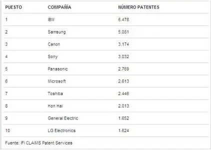 IBM ha registrado un total de 6.478 patentes durante 2012, un nuevo récord que permite a la compañía volver a liderar esta clasificación por vigésimo año consecutivo. Esta cifra de patentes es superior a la suma de todas las registradas durante el mismo año por las empresas Accenture, Amazon, Apple, EMC, HP, Intel, Oracle/SUN y Symantec. «El nuevo récord ha sido posible gracias a la actividad de más de 8.000 inventores de IBM de 35 países diferentes», señalan desde IBM.