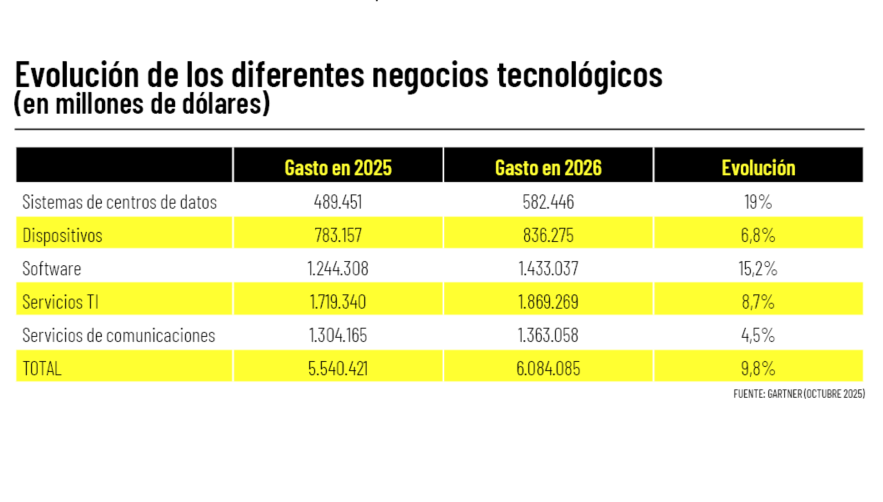 Un problema de suministro que se debe a que los fabricantes de esta tecnología están priorizando en las plantas de producción la fabricación de componentes para centros de datos, mucho más lucrativas. Un cuello de botella que, según las fuentes consultadas, se extenderá durante buena parte del año que viene. Por último, la partida de servicios TI crecerá en 2026 un 8,7% en todo el mundo, según Gartner, mientras que la de los servicios de telecomunicaciones avanzará un 4,5%.