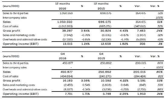 En el último trimestre del año, Esprinet facturó en España y Portugal 450,8 millones de euros, 200 millones más que en el mismo periodo de 2015, un 80% más. Otra vez, el efecto de agregar las cuentas de Vinzeo han impulsado sobremanera los datos contables de la filial. Por su parte, el EBIT del periodo se elevó a 7,7 millones de euros, un 34% más que un año antes y lo que da como resultado un margen comercial. del 1,7%.