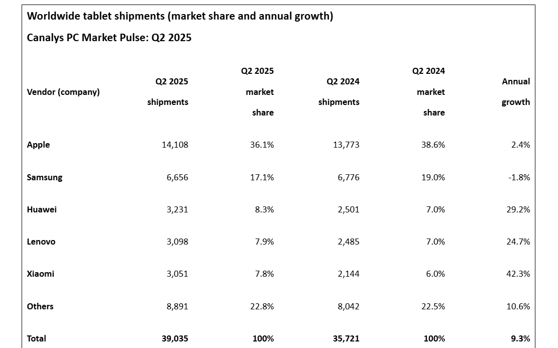 De acuerdo con los últimos datos de Canalys, los envíos mundiales de tabletas alcanzaron los 39 millones de unidades en el segundo trimestre de 2025, lo que representa un crecimiento con respecto al mismo periodo del año pasado del 9%, y de un 5% frente al primer trimestre de este ejercicio. Este sólido avance se debió principalmente a la fuerte demanda en China y la región EMEA (Europa, Oriente Medio y África).
