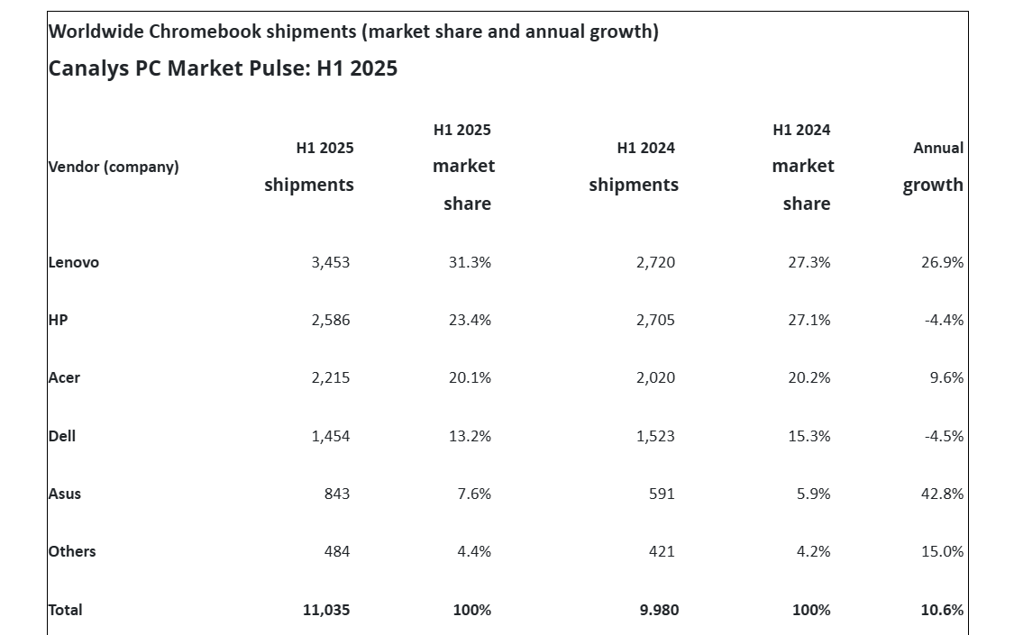 En la primera mitad de 2025, Lenovo lideró el mercado global de Chromebooks, fortalecido por su importante papel en el programa escolar japonés. El fabricante puso en el mercado 3,5 millones de unidades, lo que representa un crecimiento interanual del 27%. HP le siguió en segundo lugar, aunque perdió cuota de mercado frente a Lenovo y registró descenso del 4%.