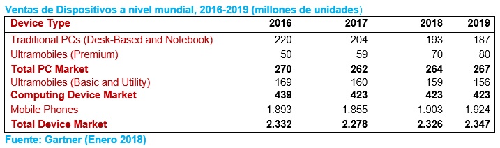 El mercado mundial de dispositivos (PC, tabletas y smartphones) ha totalizado 2.280 millones de unidades vendidas en 2017, de acuerdo con Gartner. Las previsiones para 2018 es que alcancen 2.320 millones, lo que representa una subida del 2,1%. Dos segmentos liderarán el crecimiento que se espera para 2018. El primero de ellos, el mercado smartphone y, en concreto, los dispositivos de gama alta. El segundo, los ultramóviles premium, donde sobresale Apple y los equipos Microsoft Windows 10. En esta categoría de producto, Gartner engloba aparatos como la Surface Pro o el MacBook Air. “Los consumidores cuentan con mucha y variada tecnología para elegir, lo cual supone dos nuevos retos para los proveedores: competir en un mercado de consumo con múltiples productos y proporcionar valor y relevancia, algo que mirarán cada vez más los compradores», afirma Ranjit Atwal, director de investigación de Gartner.