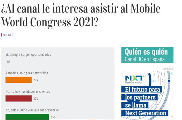 El canal TI esperará la vuelta a la normalidad para asistir al Mobile World Congress. Esa es la principal conclusión de la encuesta desarrollada por CHANNEL PARTNER para evaluar el interés que ha despertado entre los partners la celebración híbrida del principal evento mundial de movilidad. Un largo 45% de los consultados se muestra categórico y considera que solo volverán a la feria cuando vuelva a ser presencial.