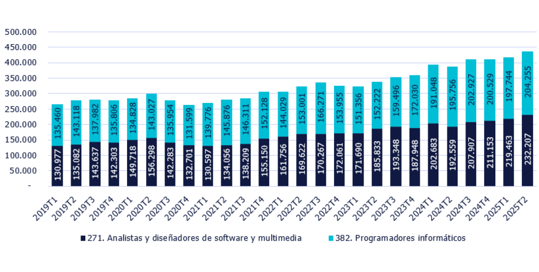 En España ya hay 436.000 programadores de software, después de que la cifra se haya incrementado un 12,5% interanualmente en el segundo trimestre de 2025. Así lo revela el último informe sobre este segmento laboral de Randstad Research. Esta ocupación se divide en dos grandes grupos: el de analistas y diseñadores de software y multimedia, con 232.207 trabajadores y el 53% del total; y el de los programadores informáticos, con 204.255 asalariados, el 47%. El primer grupo ha crecido el último año un 20%, mientras que el segundo lo ha hecho un 4%.