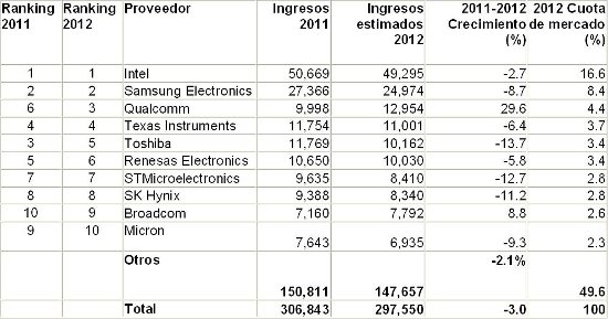 Por su parte, Samsung Electronics ha visto derrumbarse sus ingresos de semiconductores debido a la disminución de sus tres áreas principales de productos, DRAM, flash NAND y sistema de circuito integrado (IC). En contra de la tendencia de la industria, Qualcomm subió tres puestos hasta alcanzar la tercera posición y atribuyó su 29,6% de incremento a la continua adopción de teléfonos inteligentes y al crecimiento de la tecnología 3G y LTE en las regiones emergentes, como China e India. Otra de las compañías que tuvieron un crecimiento positivo en 2012 fue Broadcom, que pasó del décimo al noveno puesto con un ascenso del 8,8%. Si bien contribuyó a tales ganancias la adquisición de NetLogic Microsystems.