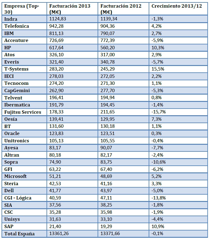 El mercado de servicios de TI en España ha tenido un comportamiento plano en 2013 (decreció un 0,1%), si bien se ha producido un leve crecimiento del outsourcing (1,1%), equivalente al descenso en la facturación de servicios de soporte y formación.