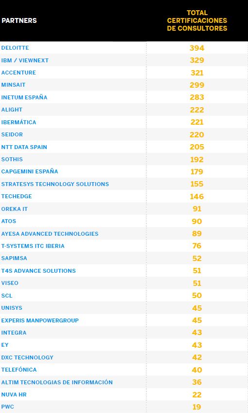 Hay que tener en cuenta que estos números no se refieren al número de personas con certificación oficial de SAP, sino al número de certificados, ya que una misma persona puede tener más de una certificación válida. Y, como nota destacada, estas cifras multiplican por algo más de tres las que estos mismos partners exhibían hace un año.