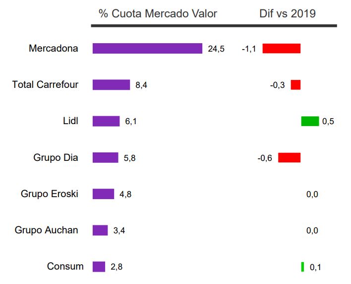 Eso ha impactado en un gigante como Mercadona, que ha tenido una fuga de negocio “en los frescos”, pero que, no obstante, sigue siendo de largo la primera cadena del mercado por volumen de ventas (acaparó el año pasado hasta un 24% de cuota, tres veces más que su más directo rival, Carrefour). “En el caso de Mercadona, los compradores probaron durante el año otras opciones de compra, y luego no han vuelto a los niveles de antes de la Covid-19. Sobre todo han dejado de comprar frescos”. También otros gigantes como Lidl o Carrefour han visto mermada la fidelidad de sus clientes.