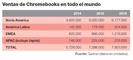 Aunque Google lleva años intentando llevar Chrome al mundo del portátil, se puede decir que el Chromebook sigue siendo un rara avis. Eso sí, las perspectivas de crecimiento de los equipos con el navegador de Google presinstalado son buenas. Según Gartner, las ventas de Chromebooks alcanzarán los 7,3 millones de unidades en todo el mundo durante 2015, un 27% más que el año pasado. El sector educativo es el terreno de cultivo de estos equipos de bajo coste. Y es que, según Gartner, casi tres de cada cuatro equipos comercializados durante el pasado ejercicio fueron a parar a colegios y universidades.