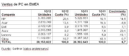 En EMEA, HP dominó con más claridad y llegó a crecer un 14,6%. La firma vendió 5,7 millones de equipos, por 3,8 millones de Acer, segundo en el ranking y que se desplomó un 8,8%. Dell, Asus y Lenovo les siguieron, con un 8% de cuota cada uno. No obstante, contrastó el avance otra vez de Lenovo (48% de crecimiento) y Asus (20%), con el más discreto de Dell (7%).