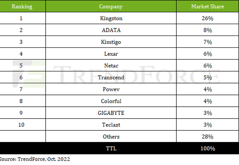 El ranking actual de fabricantes de módulos SSD está dominado por Kingston –con un 26% del total– seguido por Adata (8%) y Kimtigo (7%). De los tres primeros, solo la cuota de mercado de Kingston se redujo debido a la incapacidad de satisfacer la enorme demanda de producto solicitada por parte de los usuarios. La mayor subida de la lista fue protagonizada por Transcend que sube del décimo al sexto lugar gracias a sus buenos resultados con marcas como Apple. Entre los recién llegados destaca también el buen desempeño de Powev y Gigabyte.