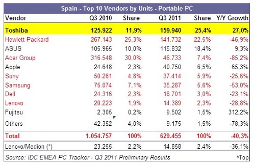 El mercado del portátil en España presenta unos datos cada vez más preocupantes. Las cifras que da IDC, que reflejan los notebooks comercializados en consumo y en el ámbito corporativo, señalan una caída de las ventas en el tercer trimestre de 2011 del 40,3% en relación a las cosechadas en el mismo periodo de tiempo del año pasado.