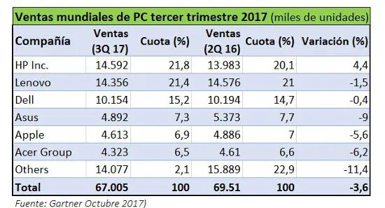 Además, es una tendencia que se sostiene en el tiempo, puesto que Lenovo, según informa Gartner, ha caído en ocho de los 10 últimos trimestres, mientras que HP encadena su quinto trimestre consecutivo creciendo. Por detrás se situaron Dell, que vendió 10,1 millones de PC y cayó muy ligeramente (-0,4%); Asus (4,8 millones en ventas y 9% de caída); y Apple (4,6 millones y 5,6% de retroceso).