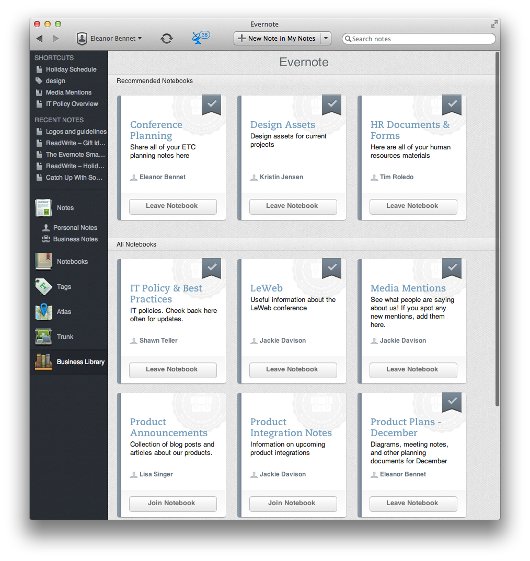 El desarrollo de Evernote Business se basa en el mismo conjunto de características que el popular servicio de Evernote para el consumidor, incluyendo funcionalidades especialmente diseñadas para satisfacer las necesidades de productividad del cliente corporativo.
