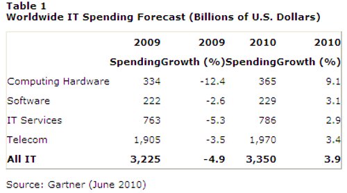 Gartner ha pronosticado que el gasto mundial en TI puede alcanzar los 3.350 billones de dólares en 2010, lo que supondría un crecimiento del 3,9% respecto a 2009, año en que el volumen de negocio llegó a los 3.225 billones de dólares.   La consultora ha reducido en cierta medida su optimismo en cuanto a las previsiones dentro del sector. En un principio sus analistas cifraron el crecimiento en un 5,3%, pero la devaluación del euro frente al dólar, acompañada de la difícil coyuntura económica internacional, han hecho que las cifras bajen hasta el mencionado 3,9%.   «La crisis que atraviesa Europa está teniendo un impacto sobre las perspectivas para el gasto en TI, el dólar se ha fortalecido respecto al euro durante el segundo trimestre de 2010, tendencia que continuará en el segundo semestre, lo que ejercerá una presión a la baja sobre el gasto en tecnología», ha señalado Richard Gordon, vicepresidente de investigación de Gartner.   Según los datos de Gartner, el gasto en hardware puede alcanzar los 365.000 millones de dólares en 2010, «las ventas de hardware para PC seguirán beneficiándose de un sector en buen estado. Esperamos que la venta de ordenadores continuará subiendo en lo que queda de 2010 y en 2011. Continuará creciendo el consumo de portátiles, mientras que en el mercado profesional habrá un ciclo de sustitución y migración a Windows 7″, añadió Gordon.