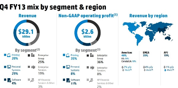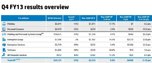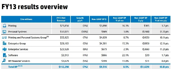 Parte de este progreso es debido al negocio empresarial pues las ventas de Enterprise Group, que básicamente engloba el negocio de servidores y almacenamiento, han subido un 2%. Del resto de áreas, al grupo de Sistemas Personales e Impresión no le ha ido tan mal, -tan solo ha bajado un 1%-, teniendo en cuenta que esta división comprende las ventas de PC de consumo, las cuales han caído un 10%; Software, un área de crecimiento esencial para la empresa, ha disminuido un 9% con respecto al año anterior; al igual que el negocio de Servicios, un negocio también estratégico para HP.
