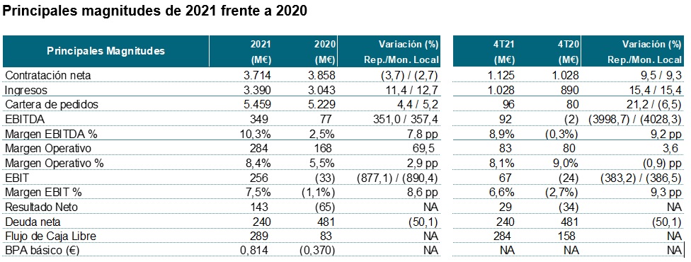 Por otro lado, el EBITDA reportado en 2021 se situó en 349 millones de euros (339 millones excluyendo 17 millones por la plusvalía de la venta de las instalaciones de San Fernando de Henares y -7 millones por la provisión del plan de inmuebles) frente a los 77 millones de euros en 2020 (231 millones excluyendo el impacto de las provisiones del plan de acción y la plusvalía por la venta de Metrocall) y frente a 346 millones en 2019.