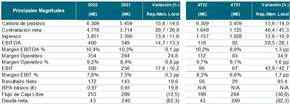 Ignacio Mataix, consejero delegado de Indra, revelaba durante la presentación de resultados que “el esfuerzo de nuestro excelente equipo, unido a la confianza de nuestros clientes, han conseguido que la compañía cierre un año 2022 que puede calificarse como histórico, ya que hemos conseguido alcanzar nuestros máximos en contratación y cartera, así como en ingresos y EBIT. Las principales partidas de nuestra cuenta de resultados crecen a dos dígitos, resultando en un crecimiento final de un 20% de nuestro beneficio por acción”.
