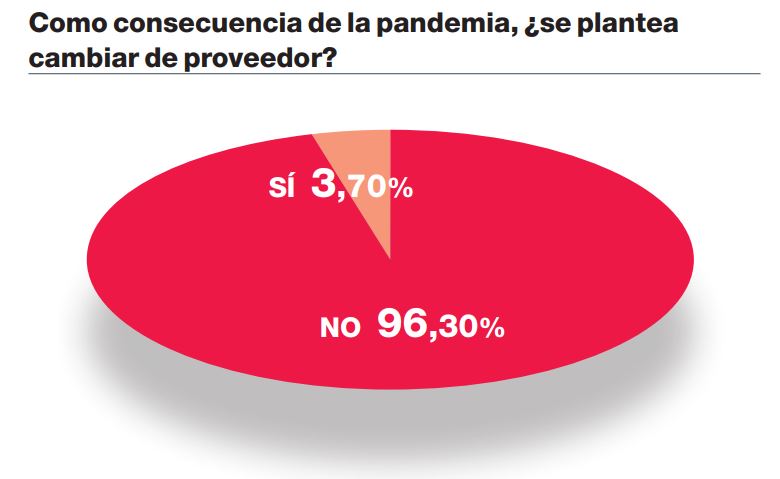 Por otra parte, la Covid-19 no supondrá cambios de proveedor en la amplia mayoría de los casos. De hecho, un 96% de los encuestados así lo manifiesta. Mientras que solo el 4% restante sí apunta a esta posibilidad. Así, hasta un 65% se muestra satisfecho con el catálogo de soluciones que comercializa, y otro 30% llega a decir que está “muy satisfecho” con el mismo.